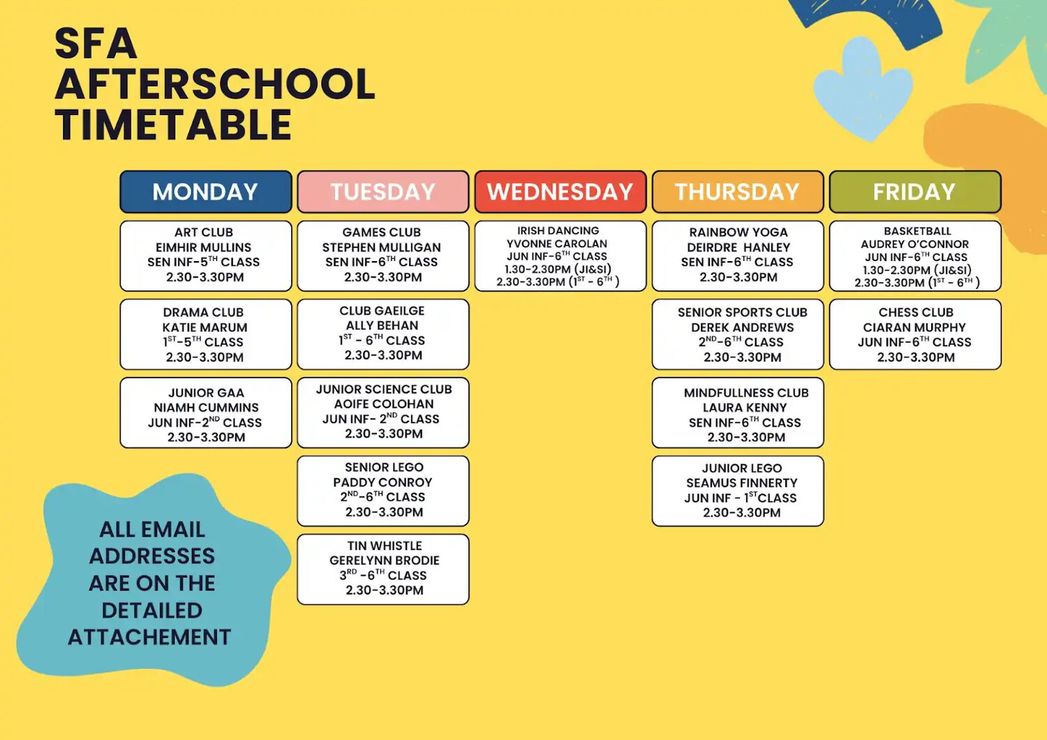 Payment must be made on or before the first day of club's commencing. Otherwise the place will go to the next child on the list. Please contact the relevant teachers regarding payment methods.